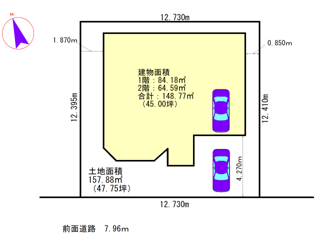 | 地積状況 | 南向き 間口 12.73m 前面道路幅7.96m |